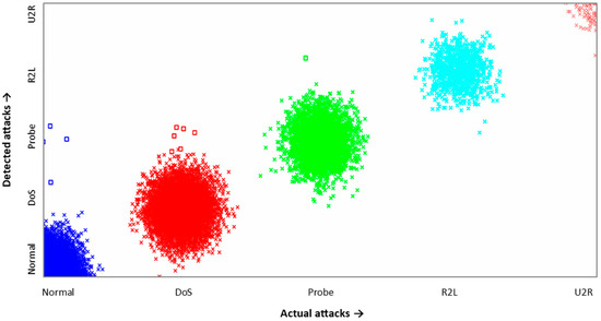 Similarly, when all the features are used to build the detection model, it is observed that the U2R attacks are nicely detected with 100% accuracy, detection rate, and precision. The ROC curve of U2R attacks also supports the claim. The AUC value of U2R lies at 1, indicating the IDS detector is a perfect detector for U2R attacks.