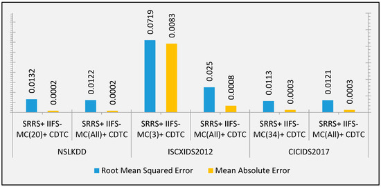 The SRRS algorithm performs consistently for all three datasets for varying sampling thresholds. The sampling thresholds considered here are 20,000, 60,000, and 100,000. In the case of the NSLKDD dataset for these sampling thresholds, SRRS generates 19,080, 56,032, and 87,312, respectively. This sample set leads to a very low sampling error of 0.007, 0.003, and 0.002, respectively. A similar kind of performance outcome is found for the ISCXIDS2012 and CICIDS2017 datasets.