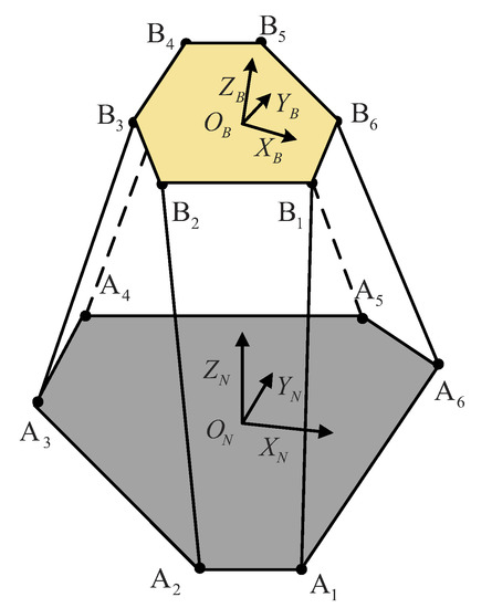 In order to describe the relative configure pose between two platform, one coordinate frame is fixed at geometric center of lower fixed platform , another frame is fixed at geometric center of upper moving platform . Let denote the configure pose (position and orientation) of geometric center of upper moving platform represented in lower fixed frame .