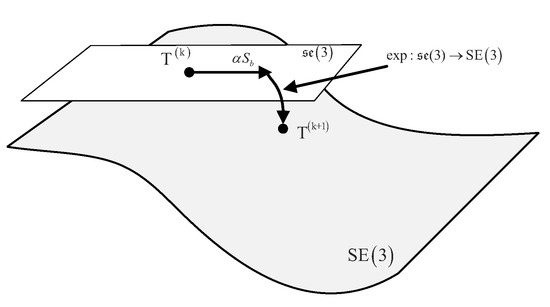 In order to minimize the quadratic sum of kinematic residual error , the numerically iterative algorithm is updated iteratively by means of a small increment until convergence or the max number of iteration is reached. It should be noticed that all these numerical iteration schemes are originally designed to work on flat Euclidean space, i.e., . If the update process was designed on generalized coordinates according to Equation (16), there exists a gimbal lock problem as well as three Euler angles that may reach out of their valid ranges. In this section, we begin to build up two elegant iterative algorithms on the Lie group-structured manifold SE(3) with differential properties from theory of the Lie group and Lie algebra.
