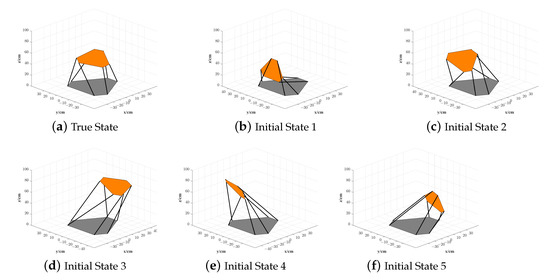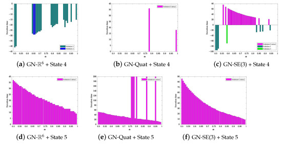 The other algorithms that were constructed on quaternion-based Euclidean space and SE(3) are expected to improve the convergence performance when starting from state 1, state 2, and state 4 because both of them have kept the orthogonal constraint at each iteration process. Meanwhile, state 3 and state 5 are necessary moderate choices to verify the reliability of the other two algorithms. In order to evaluate the influence of the step factor on algorithm performance, the step factor is selected from 0.50 to 0.99 with an equal interval of 0.01. The reason to choose a relatively large value for the step factor is to make sure at least half of the derived updating direction could be exploited at each iteration. All tested G-N type algorithms share the same accuracy threshold (, , ), and max iteration time to end their iteration. Figure 4b–f corresponds to these five initial guess states of the G-S platform, respectively.