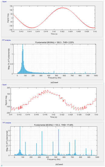 Figure 9 shows the stator current waveforms and Fourier analysis results in four cases. (a), (b), (c), and (d) respectively represent the results of Case 4, Case 3, Case 2, and Case 1. Total Harmonic Distortion (THD) indicates the degree of waveform distortion caused by all harmonics. The smaller the THD, the lower the degree of distortion between the waveform and the sine wave of a certain frequency. The proposed controller has a THD of 2.25% in Case 4, 17.00% in Case 3, 2.26% in Case 2, and 2.62% in Case 1. The sines of the waveforms in Case 2 and Case 4 are comparable, while the sine is slightly worse in Case 1 and the worst in Case 3. The smoothness of the waveform generated by the traditional FCSMPC is low. While the improved duty cycle FCSMPC is used as the current controller in Case 2 and Case 4, the smoothness of the waveforms is the highest. Therefore, the effectiveness of the proposed current controller can be further proved.