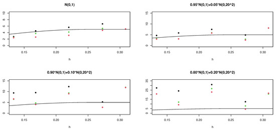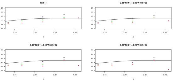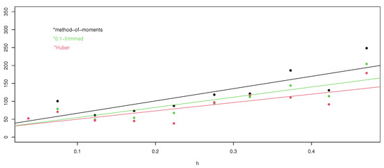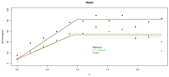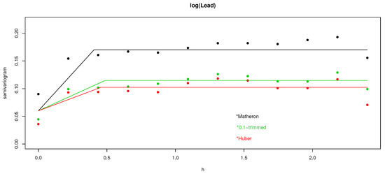 Figure 5), this variogram model does not represent the classic variogram estimations; only in some cases it represents the 0.1-trimmed variogram estimations, and it can be accepted when we consider Huber’s variogram estimations except, perhaps, in the last case, where it is doubtful.