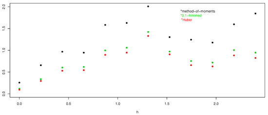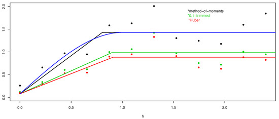 The values of the classical method-of-moments estimator, the 0.1-trimmed cross-variogram estimator, and the Huber’s cross-variogram estimator (with tuning constant
