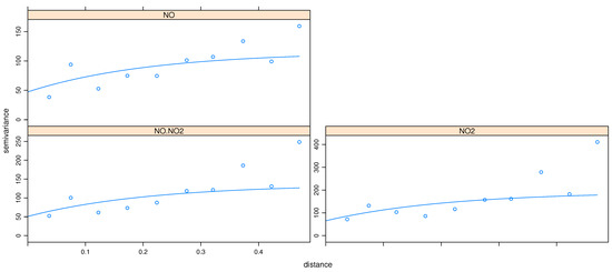 Example 3. Let us consider the geolocated pollution data, included in the Supplementary Materials, that are the 2017 average concentrations of four air pollutants in the Community of Madrid (Spain): nitrogen monoxide (NO), nitrogen dioxide (NO2), suspended particles with a size less than 10 microns (PM10), and ozone (O3). These data are obtained from 22 monitoring stations [24,25,26]. Two of these 4 variables are strongly correlated and have a distribution similar to a scale contaminated normal model; they are NO and NO2.