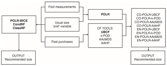 - CO-POLR-UBCF CO-POLR-UBCF combines the information of the variables with complete cases with the user preference information with missing data using UBCF. UBCF is used as an imputation method. UBCF is used with the variables with the preferred size for each model to give a recommended size for the missing values. Then, we apply POLR to these data together with the anthropometric measurements and the variable ‘pref’.