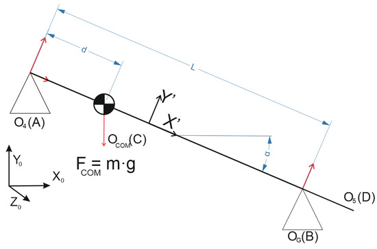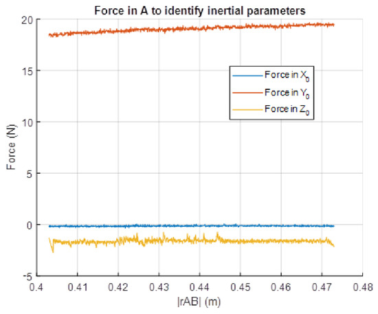 To calculate the mass of the manipulator and its COM it is necessary to modify the absolute value of the vector . This is achieved by moving the manipulator in the direction of the support point. It is necessary to bear in mind that when these movements are carried out, inertial forces and moments and friction forces of the manipulator appear on the support point. Executing a movement parallel to XZ plane and cancelling the height difference between the manipulator and the turning point , force components on the X0 and Z0 axes disappear. Measuring the value of the force on the Y0 axis at the force sensor on the Equation (19), the Equation (25) is obtained.