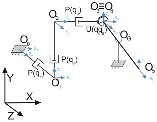 The cartesian robot includes three active prismatic joints (q1, q2 and q3), which represent the three linear movements along the cartesian axes, and two passive universal joints (q4 and q5). The parameters q1, q2 and q3 are the active variables and represent the three linear movement of prismatic joints, while q4 and q5 are the passive variables and represent the generalized coordinates of the universal joint. The manipulator is considered like a straight stick—parameter L of the Table 1 indicates distance between of center O4 and O5 at X5 axis, parameter d it the distance between center O4 and O5 Z5 axis.