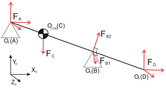 Knowing the mass and the COM of the manipulator, as well as the measured force in point A and with the force of the sensor in point A, it is possible to know the force exerted at the extremes of the manipulator. Using again the equations of static equilibrium of a rigid solid, we have a total of 5 unknows—3 axes of forces at the extreme point, 2 reactions at the support point—one parallel to the plane generated between the vector and the gravity vector that is called FB1 and a second force perpendicular to the vector and belonging to the anterior plane (Figure 4), that is called FB2.