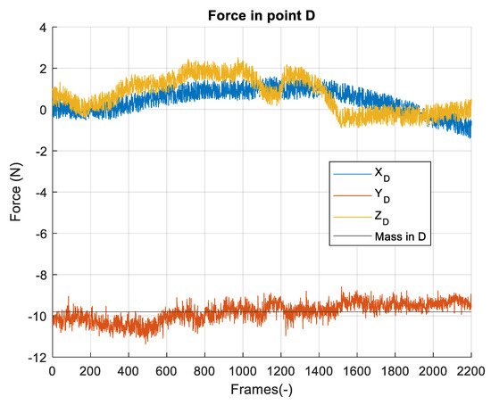 To check the correct running of calculation of the manipulator’s end point, a known mass has been applied at the end point, O5, and it has been checked if the method could solve the correctly applied force (Table 3), with an acceptable error (Figure 8).