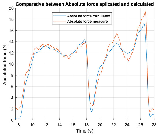 To measure the method’s error, the absolute relative error has been used [34] (21), using the calculated forces (), the measure forces (), and the mean of the measured forces (). The absolute relative error represents the differences between the calculated value and the measured value with respect to the differences between the mean value and the measured value. The error obtained is 19.79%.