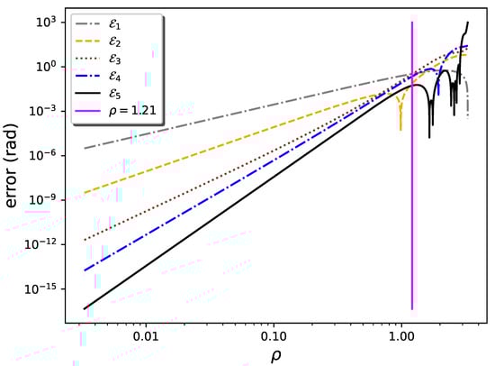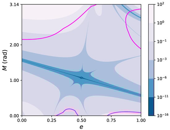Figure 3 shows the contour levels in the plane of the error affecting the fifth degree polynomial approximation, , as given by Equation (30). The continuous magenta curve marks the boundary of the region of convergence, as estimated with Equations (20) and (26). It can be seen that the Taylor series based in the mid point converges in a significant part of the plane. Moreover, the fifth degree polynomial reaches machine precision in an elongated neighborhood of the point along a diagonal line crossing the entire e domain from to , with transverse size (along the M direction) ranging from ∼ rad close to the endpoints, to ∼ rad around the center .