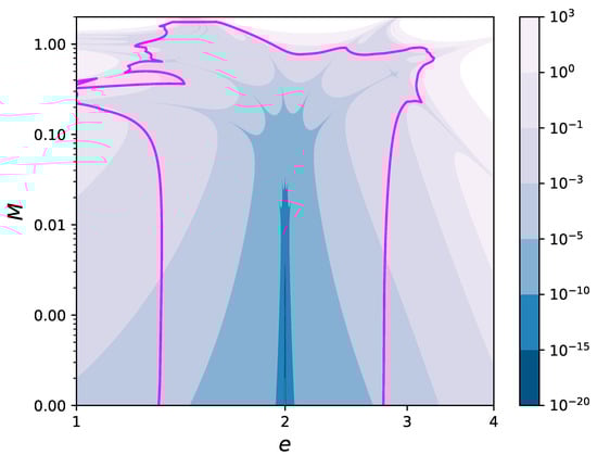 For the hyperbolic motion, the values of e and M can vary in infinite ranges, , (due to the symmetry for ). In Figure 4, the contour levels in the plane of the error for the solution (31) have been drawn in the region , . This region has been chosen in such a way that the plot contains the magenta curve marking the boundary of the region of convergence, as estimated with Equations (20) and (26). Moreover, the fifth degree polynomial reaches machine precision in an entire neighborhood of size , , around the point .