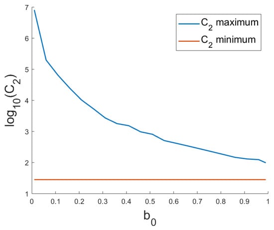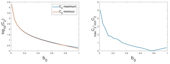Numerical estimate of the stability constant in (24) for . To illustrate the behavior on b, we plotted the maximum and minimum value when with respect to b in logarithmic scale (left), and its range in normal scale (right).
