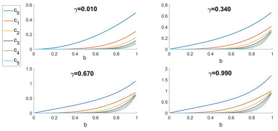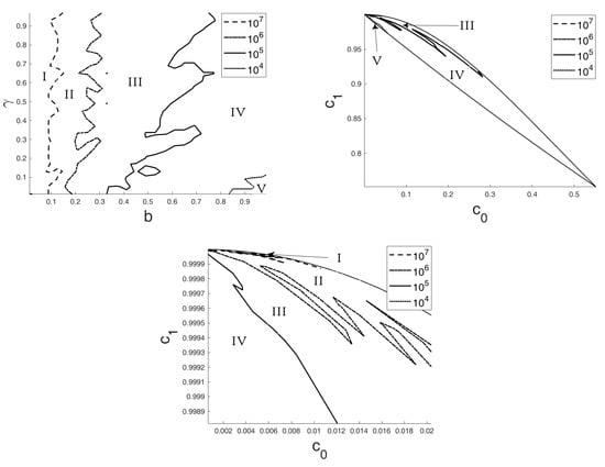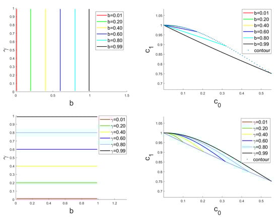 In Figure 6, we show the level sets of for and different . The region with a larger constant corresponds to small values of b (upper right figure) and larger values of (upper left and lower figures). On the contrary, the region with a lower stability constant is for b close to , which corresponds to the lower part of the range of when is small.