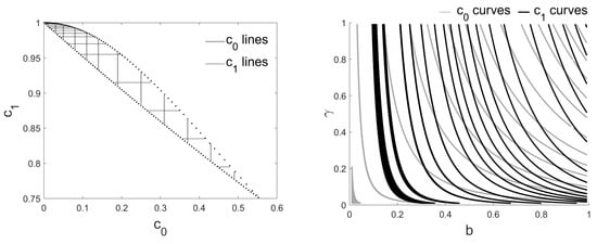It is interesting to analyze the set of potentials with the same coefficient or . We provide, in Figure 7, the coordinate lines of the inverse map . When increasing the value of either (light lines) or (dark lines), we obtain lines closer to the left part of the region. We can see that the angle between coordinate lines becomes very small for small b. In this region, close points could be the intersection of the coordinate lines associated with not so close parameters . This agrees with the region where the stability constant is larger.