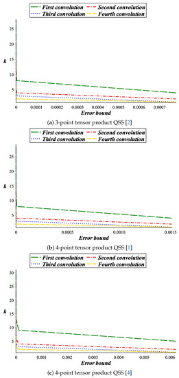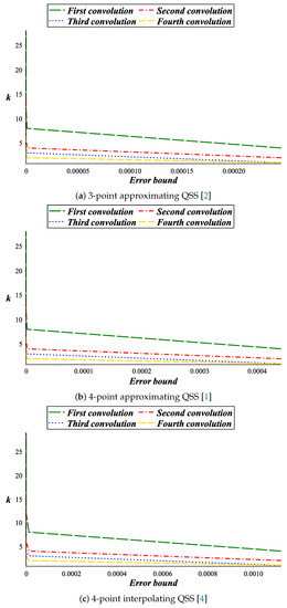 Furthermore, to be more specific, update the track defined in [20] for the computation of error bounds and subdivision depth. Let, at the kth level of resolution, the vector represents the approximation coefficients. Then the approximation coefficients of two consecutive stages k and in the reconstruction process of QSS is defined as