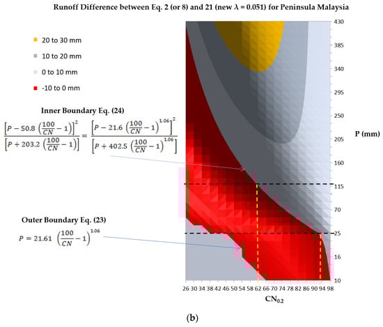 The dash line on the 3D model in the valley of the red zone is described by Equations (25) and (27) while Equations (26) and (28) represent the dash line found on the ridge of the 3D runoff difference model (see Figure 2a). SCS practitioners can adopt Equations (25)–(28) to estimate the worst-case runoff prediction errors of Equation (2) when compared to the newly found λ (0.051) model in Peninsula Malaysia. On the other hand, regional or watershed specific equations can also be established by SCS practitioners for their study as proposed.