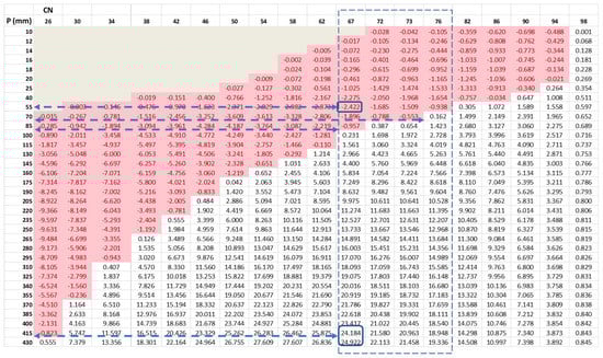 Based on the rainfall depth range of the dataset [], a numerical table can be compiled with Equation (10) through the substitution of different P, CN0.2 scenarios and the λ value to quantify runoff depth prediction difference between two runoff models in a table. A 3D model can also be constructed with the collective information from the table (Section 3.7). With the visual aid of a 3D runoff difference model, it is possible to extract all minimum and maximum runoff prediction difference amount and represent them with statistically significant equations. The minimum under-prediction difference amount equation represents the worst under-design case incurred by Equation (2) and vice versa.