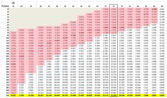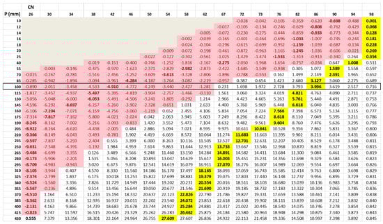 In general, Equation (10) represents the runoff prediction errors of Equation (2) under multiple P and CN0.2 scenarios but it is difficult to visualize the quantified effect by looking at Equation (10) and solve for the global maxima and minima in order to represent the worst under and over runoff prediction amounts between two runoff models.