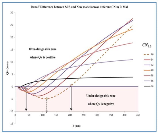 Figure 6 illustrates the use of runoff difference curves to identify the “critical rainfall amount” (Pcrit) of several CN0.2 scenarios. For example, at CN0.2 = 46 (dash line curve), Pcrit is approximately 40 mm and 205 mm (eyeballed from the graph, Pcrit points are marked by solid downwards arrow where the curve intersects the x-axis, implying that Qv is near to 0). However, the Ia amount has not been initiated for rainfall less than 40 mm according to Figure 3 and therefore, only 205 mm was used as the original trial and error estimate to satisfy Equation (22) and solve for the final solution of Pcrit of CN0.2 = 46.