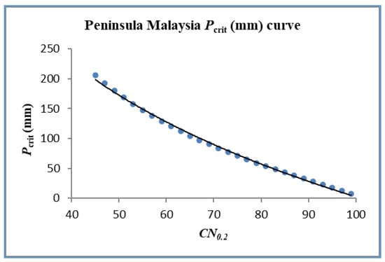 Pcrit overview curve for Peninsula Malaysia. Equation (2) under predicts runoff amount for any rainfall depths below the curve at respective CN0.2 area. The underprediction tendency worsens as CN0.2 value decreases.