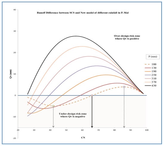In Equation (10), Qv will be positive when the conventional SCS runoff model (Equation (2)) over-predicted runoff when compared to the calibrated new runoff equation and vice versa. If the newly derived λ < 0.2, Equation (10) is subject to the constraint where P > λS. When the new derived λ > 0.2, Equation (10) will abide to the constraint of P > 0.2S0.2, else Qv = 0 because there is no runoff difference as Ia of the lower λ value model is yet to be fulfilled to initiate the runoff process [,] and produce a runoff difference between two runoff models. All in all, the smaller λ runoff model will initiate runoff ahead of the larger λ runoff model [].