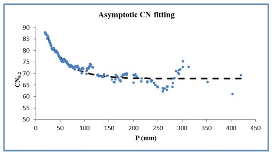 Asymptotic CN fitting of the dataset. For standard behavior pattern, CN∞ is the point where a near to stable state of CN0.2 fits to the higher rainfall depths.