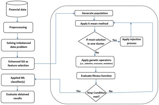 The proposed method of this work is depicted in Figure 1. The PDC-GA enhances the performance of GA by controlling the population diversity of GA. In this work, GA works as a feature selection method. After collecting the financial data for companies based on historical data, eliminating the weak features will enhance the overall performance of ML classifier(s) by reducing the search space of this problem. The population diversity is controlled by clustering the population based on k-means method and redistributing the solutions once most of the solutions are related to one cluster. An adaptive injection process is proposed to balance the exploration and exploitation of GA. Five different ML classifiers are employed to evaluate the selected features. Moreover, we applied the K-fold cross-validation with k-fold = 10 to avoid the overfitting problem. The following subsections explore the proposed method in more detail.