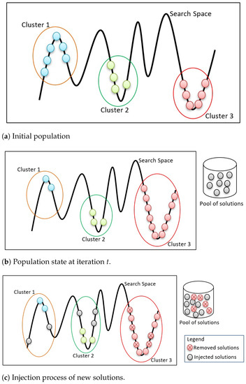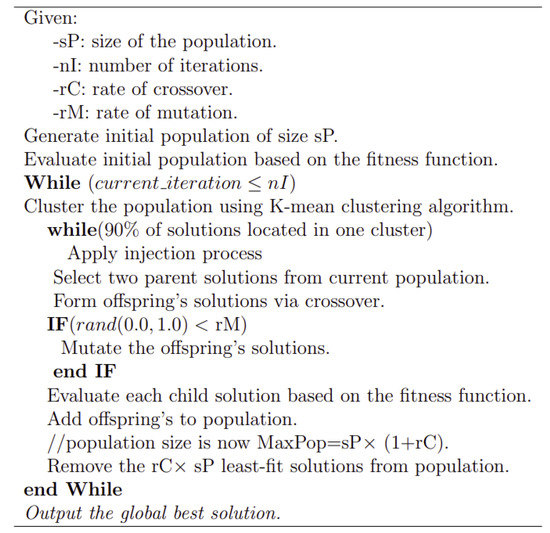 Figure 5 presents the pseudo-code for the injection process, which presents the redistribution process of the solutions in the search space once 90% of the solutions are located in one cluster. Since the population size is fixed in GA, the number of injected solutions should be equal to the number of removed solutions. This number is determined based on Equation (2), where presents the highest number of solutions located in clusters, presents the lowest number of solutions located in clusters, presents the maximum number of iterations, and presents the population size. All injected solutions are obtained from a pool of solutions (i.e., generated randomly) to make sure they are distributed over the search space.