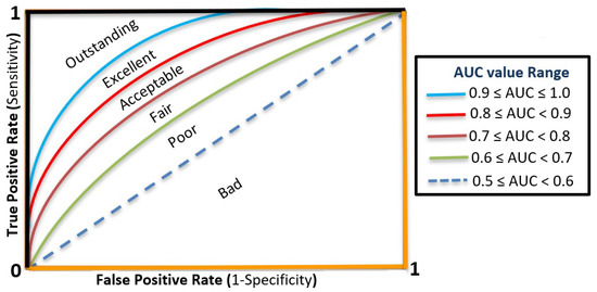 where CV represents the cross-validation accuracy, k represents the number of folds (i.e., k-fold = 10), and A represents the AUC value for each fold. Figure 6 demonstrates a pictorial diagram for AUC curves with its meanings.