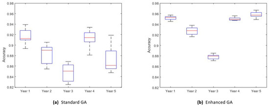 Finding the most important features for the bankruptcy problem gives us more information about this problem. We executed 21 different independent runs for each year. Table 4 explores the obtained results for standard and enhanced genetic algorithm without imputing missing data (i.e., removing missing data). It is obvious that the proposed approach outperforms the standard genetic algorithm based on fitness value and the number of selected features. For example, the year 1 results show that the performance of enhanced GA is , which outperforms the standard GA, which is . Moreover, the number of selected features is improved for all datasets. For example, there are 18 features selected using standard GA for year 5, while enhanced GA selects 14 features. The reported selected features are the best features out of 21 independent runs. Reducing the number of features will reduce the computational time for machine learning and remove the redundant/irrelevant features. Boxplot diagrams for enhanced GA and standard GA are presented in Figure 7. It is obvious that the performance of enhanced GA for all years has more robust performance compared to the standard GA during the 21 independent runs and able to overcome the premature convergence during the search space. Figure 8 demonstrates the performance of the exploration process for both methods. It is clear that an enhanced genetic algorithm is able to explore the search space better than standard GA.