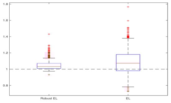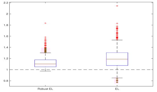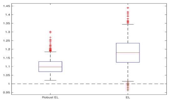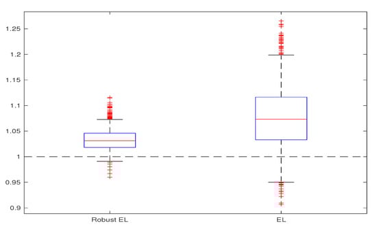 with , respectively . The considered sample sizes are and All the simulations are repeated 1000 times. The obtained estimates are compared through bias, variance, and mean square error, computed on the basis of the 1000 replications. We give the corresponding box-plots in Figure 1, Figure 2, Figure 3 and Figure 4, where the true value of the parameter is presented with horizontal dashed line. For computing the proposed Robust EL estimate (26), we use the truncated functions and with . The algorithm for computing the estimate was obtained by adapting the one from [] (Appendix A.1., p. 3196). Namely, for each iteration, the estimation of the parameter , corresponding to the new orthogonality function in step iii, is computed using Uzawa algorithm for the saddle-point optimum in (26). The obtained results are presented in Table 1, Table 2, Table 3 and Table 4 and Figure 1, Figure 2, Figure 3 and Figure 4. All these results illustrate the fact that, in the case of contaminated data, the robust EL estimator outperforms the classical EL estimator.