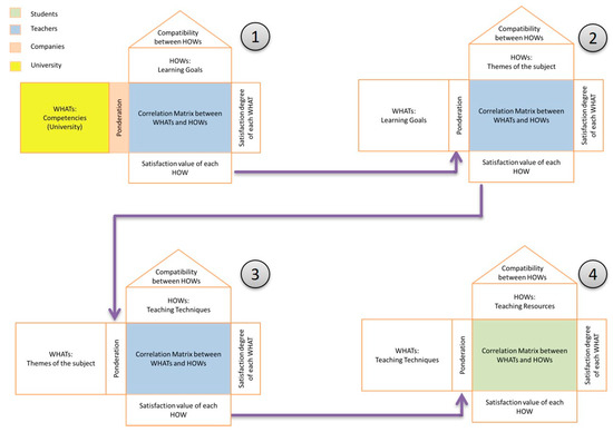 This methodology is based on the concatenation of matrices called “Houses of Quality” (QFD) [22,34,35]. The QFD technique uses decision matrices to relate and weigh the client’s needs (WHATs) with the attributes that allow the satisfaction of these needs (HOWs). In the proposed method, four concatenated matrices are considered that relate the main aspects of the teaching process of a subject two to two (Table 1). In this way, the WHATs will be different in each of the proposed matrices, and the weighted HOWs of a matrix will be the WHATs of the following matrix.