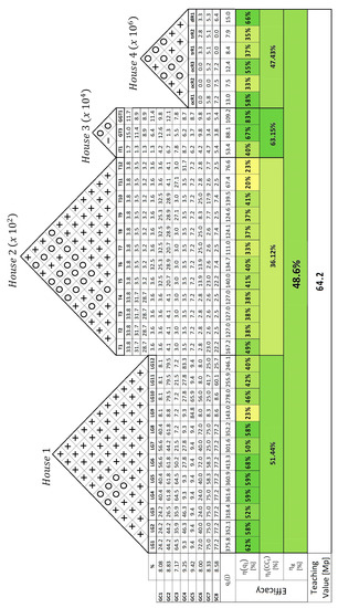 - The sum of all the components of the vector (13.0, 7.5, …, 15.0) allows the “Teaching Value” to be determined (64.2 Megapoints). The overall effectiveness of the teaching of the subject, , can be determined by direct application of Equation (17) or as a geometric mean of the product of the efficiencies of the four houses of quality; that is:
