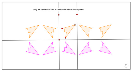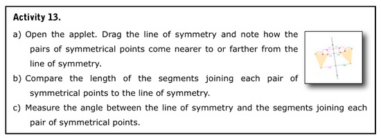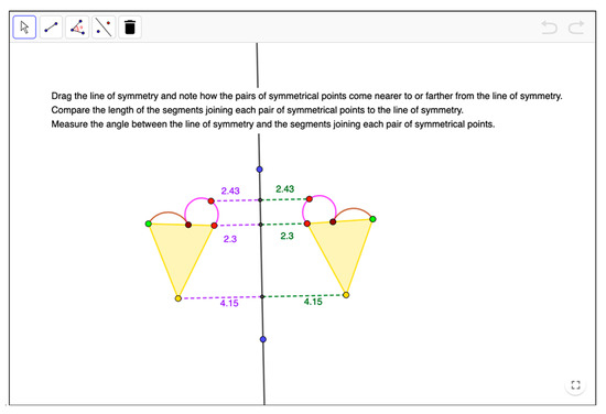 Research literature has demonstrated that, in the context of regular classrooms with heterogeneous groups of students, DGS has proved to be useful to create teaching units based on the methodology of guided discovery [34,35] allowing the coexistence of different students’ learning styles and needs, from slow learners or those not interested in mathematics to m-gifted students willing to learn more [36]. The diverse ways of doing and understanding dragging, all of them implicitly based on the transformational-saliency hypothesis proposed by Battista [37], allow different students’ learning processes, from the empirical discovery of mathematical facts to the generalization and abstraction of general properties. These ideas grounded the teaching unit we have designed, since the activities based on GeoGebra applets offer students different possibilities of learning, from visual perception of regularities to identification of abstract geometrical relationships and properties. We have also designed the sequence of activities to improve students’ conceptions as they advance in the solution of the activities and to allow m-gifted or interested students go farther in the learning of properties of symmetries.