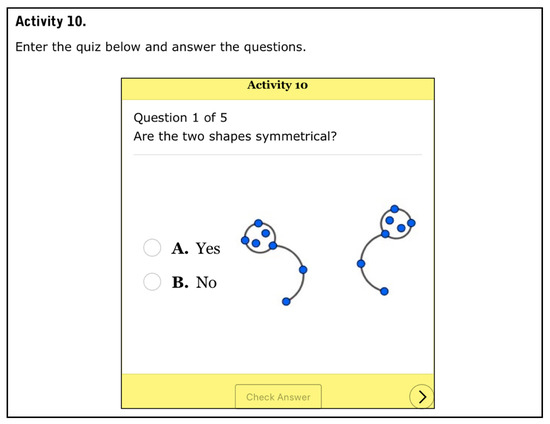 Activity 10 (Figure 3), like other activities along the e-book, poses students a set of multichoice questions to assess the knowledge they have acquired in the previous questions. This activity shows some pairs of congruent or similar figures and asks students to decide if they are symmetrical or not. This activity checks the visual understanding of symmetry gained in the previous nine activities, so answering it requires only visual reasoning (VH 1), without the need of using geometrical properties and having to make a limited cognitive effort (CD 2) to solve it.
