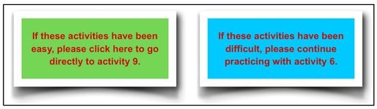 To manage the issue of the different complexity of the activities in the teaching unit and letting students self-control their progress, the e-book includes several points where students are asked to reflect on their progress and success in a given set of activities, and decide which is the best way for them to advance in the learning of the mathematical contents. The e-book may suggest students having difficulties to go back to work again on some activities or go ahead skipping over some difficult activities, while it suggests m-gifted students to go ahead skipping over some easy activities. By clicking on the adequate box, the e-book points at the next activity to be solved (Figure 4).