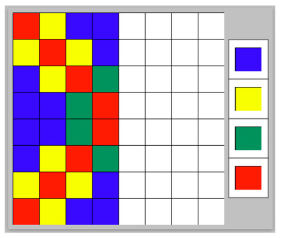 Activity 3 connects to another web page which presents several patterns (Figure 5) where students have to complete the blank side to make a pattern with vertical symmetry. When a tile is connected to a wrong position, the app does not register the result and the square remains blank. To solve this activity, students only need to use their concept image of a figure with vertical symmetry to visualize the colors of the blank tiles (VH 1). To solve the activity, students do not need to use equidistance or perpendicularity with respect to the axis, since there is not explicit connection to the geometrical properties of symmetries, so the cognitive effort necessary to solve it is limited (CD 2).