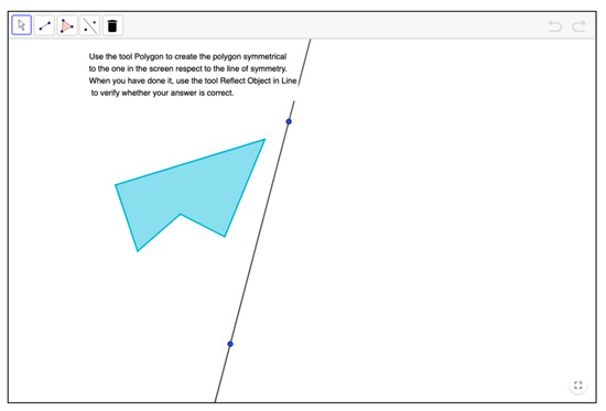 Our interpretation of the teaching methodology of guided discovery [81] by problem solving includes teachers asking their pupils for explanations and justifications of their processes of solution and answers, and giving them, when necessary, some clue or other kind of help. This is difficult, or even impossible, to do really when students use the teaching documents on their own, but it is possible in those on-line courses that include interaction between teachers and students. Anyway, the spirit of the e-book is that students should think on their solutions and should try to check their correctness. To induce the former, the statements of some activities ask students to explain their solutions (not all activities ask it, to avoid being repetitive). To induce the latter, whenever possible, the activities offer students an alternative automatic way of getting the solution; for instance (Initial window for activity 14), if an activity asks students to draw the symmetric of a shape by hand with the GeoGebra tool Polygon, it also includes the tool Reflect Object in Line, so students, after having drawn their shape, can use this tool to construct the correct symmetric shape and compare it to their own one.