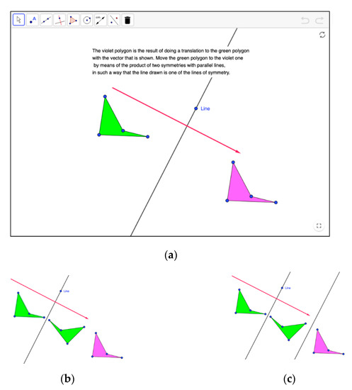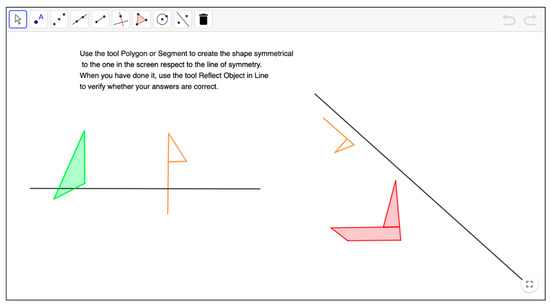Research in mathematics education has repeatedly showed the positive influence of students’ use of DGS in promoting their observation of many different drawings of a same figure [76] to isolate characteristic properties and construct good conceptions of mathematical objects, dragging actions being the main element [3,37,77]. In line with such results, we have been careful in including in the statements of the activities suggestions asking students to drag points, figures, and axes whenever possible and as much as possible. The easiness to change the orientation of axes in DGS helps prevent the mentioned students’ prototypical conceptions of symmetry, by helping students detach from a physical static conception of symmetry, typical of levels VH 1 and CD 2, and start identifying its invariant geometric properties [78], so moving to the levels VH 2 and CD 3. Anyway, we have taken into consideration the didactical information about possible sources of students’ errors and misunderstanding and we have been careful when designing the activities to present the axes of symmetry in several positions. This is particularly important for activities where the axes are fixed or students who do not feel necessary dragging them. The use of GeoGebra should also help m-gifted students to solve the activities focused on learning the characteristics of products of symmetries and decompositions of translations and rotations, therefore promoting their progress from levels VH 2 and CD 3 to VH 3 and CD 4.