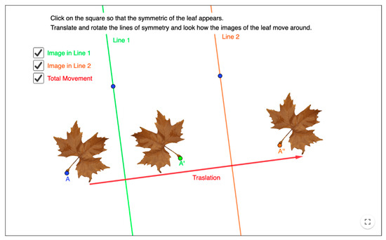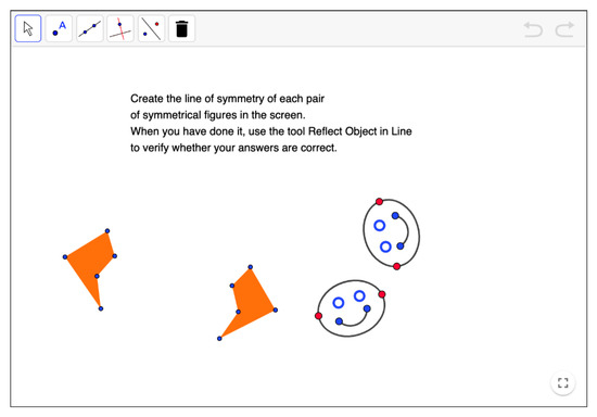 The learning of symmetries has some obstacles and difficulties that should be taken into consideration by teachers when preparing the classes, to try help students bypass or overcome them. After the seminal research by Küchemann [13,14] on students’ difficulties with plane symmetries, there is a knowledge of some typical errors that should be prevented by designing specific activities, like the cognitive obstacle [15] induced by the prototypical image of the axis of symmetry drawn vertically. Technological environments, like those based on DGS, have proved to be helpful to prevent or remove this kind of students’ prototypical images when they are allowed to manipulate the axes of symmetry and get used to see them with any slope [16]. Then, although teaching and learning of isometries have not been frequently explored by mathematics education research [7], an interesting research direction is the design of technological environments where students can manipulate geometrical objects (in our case those related to symmetries) to gain experience and build on it a deep understanding of the related concepts and properties [2]. In this paper we present a teaching unit for symmetries implemented as an interactive e-book [17] that takes advantage of the possibilities of DGS played in computers and tablets.