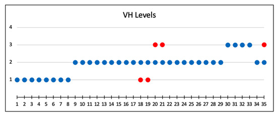 The Van Hiele levels characterize the different types of mathematical reasoning used by students of different ages and mathematical abilities when they solve mathematical activities. The model includes five levels, although usually only the levels 1 to 4 are considered when dealing with primary or secondary school students. In particular, in this paper we only use levels 1 to 3, since we are focused to primary school average and m-gifted students. The main characteristics of levels 1 to 4, particularized to the study of symmetries, are [37,40,62]: