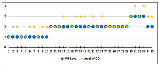Mathematics education research has showed that there are some prototypical figures that hinder the learning of mathematical concepts, more frequently geometrical concepts like some types of polygons and polyhedra [72], altitude of triangles [73,74], or isometries [13], among others, making students create poor concept images [3,75]. For our purposes, the most relevant are the prototypes related to the symmetry. Grenier [39] analyzed the influence of different variables that may hinder or facilitate the drawing of images or axes: drawing on squared or white paper, calculating the images of points, segments or more complex figures, the orientation of the axis of symmetry respect to student’s horizontal (horizontal, vertical, slanting at different angles), the distance of the object from the axis (far, near, touching it, cutting it). A main result reported by several researchers [13,39] is that the most prototypical position for the axes of symmetry are vertical axes, inducing in students the concept image of reflection as a horizontal movement, even when the axis is not vertical. Horizontal axes also induce a similar prototypical concept image, although it is less frequent. Prototypical images make students base their solutions to the activities on basic visual reasoning where shapes, positions, sizes, etc., are unduly relevant and, therefore, students’ reasoning remain in VH 1 and CD 2. Taking into consideration the obstacles students may suffer and adopting actions when designing the activities to prevent or correct them is a way to make easier the transition of students from VH 1 to VH 2 and CD 2 to CD 3.