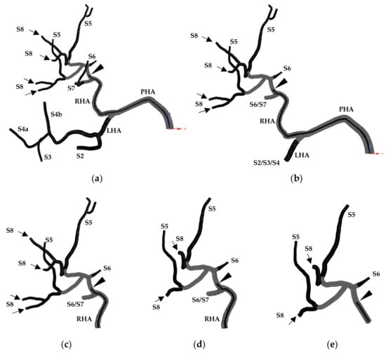 Patient 1 hepatic artery tree simplifications: (a) Baseline geometry (i.e., Patient 1-Baseline); (b) Upstream branches truncation (i.e., Patient 1-Reduc1); (c) Upstream truncation, 3 cm from the microcatheter position (i.e., Patient 1-Reduc2); (d) Intra-segmental branches truncation (i.e., Patient 1-Truncated-3cm); (e) Truncation before the first upstream branch (i.e., Patient 1-Reduc3). PHA: proper hepatic artery; LHA: left hepatic artery; RHA: right hepatic artery. Arrowheads indicate microcatheter-tip location. Arrows indicate branches feeding the tumor-bearing segment. S1–S8 in each outlet indicates that all the downstream branches arising from that outlet feed that segment.
