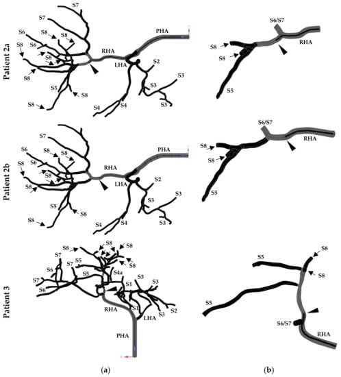 Patient 2 and Patient 3 hepatic artery trees: (a) Baseline geometries (i.e., Patient 2a-Baseline, Patient 2b-Baseline, and Patient 3-Baseline); (b) Truncated geometries (i.e., Patient 2a-Truncated-3cm, Patient 2b-Truncated-3cm, and Patient 3-Truncated-3cm). PHA: proper hepatic artery; LHA: left hepatic artery; RHA: right hepatic artery. Arrowheads indicate microcatheter-tip location. Arrows indicate branches feeding the tumor-bearing segment. S1–S8 in each outlet indicates that all the downstream branches arising from that outlet feed that segment.