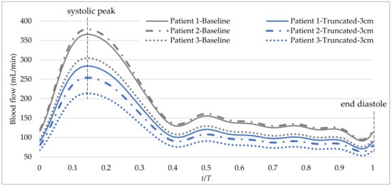 As explained before, an extra case was generated due to these differences. An extra centimeter was left upstream, giving as a result of the case Patient 2b-Truncated-4cm. The differences between Patient 2b-Baseline and Patient 2b-Truncated-4cm are 10% in S5, of 0.1% in S6, and 9.9% in S8. It is important to note that even though smaller truncation is applied in Patient 2b-Truncated-4cm, the differences with respect to the baseline case increased, compared to the differences between Patient 2b-Truncated-3cm and the baseline case. Thus, the case Patient 2b-Truncated-3cm has been considered a valid simplification.