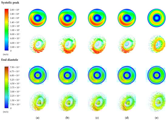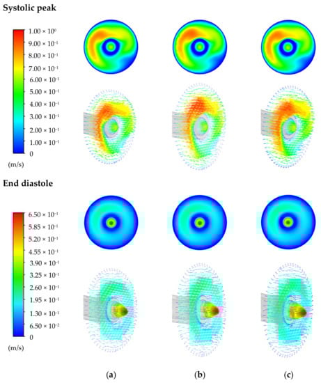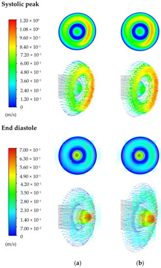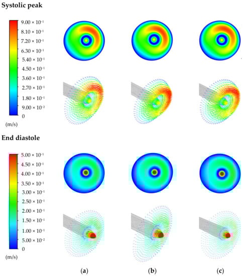 - Velocity magnitude contours and velocity vectors at the systolic peak and end diastole (see Figure 3) at the cross-section of the microcatheter tip: to qualitatively analyze important changes in the blood-flow pattern near the microcatheter tip. The important postprocessing is the segment-to-segment microsphere distribution for its clinical implications, but blood-flow patterns should be similar between the baseline and truncated geometries so that the microsphere distribution is also similar.