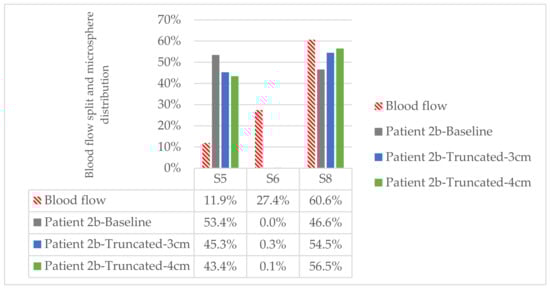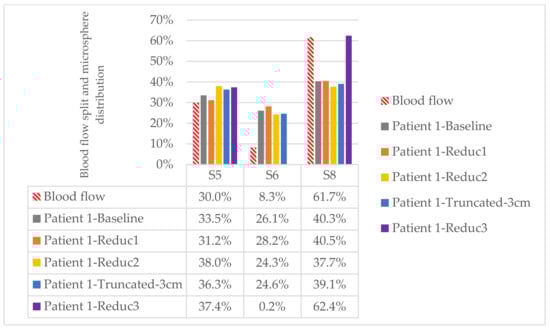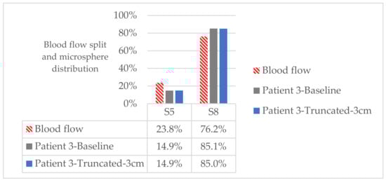 However, if we compare Patient 1-Baseline and Patient 1-Truncated-3cm, where no considerable differences are seen in velocity contours and vectors (see Figure 4), the differences in microsphere distributions are 2.8% in S5, 1.5% in S6, and 1.2% in S8 (see Figure 5). The maximum difference in percent points is below 3%, so this case is regarded as a case with a valid geometry truncation. As explained before, the same simplification criteria used to create Patient 1-Truncated-3cm was used in Patients 2 and 3, to analyze the usefulness of the criteria.