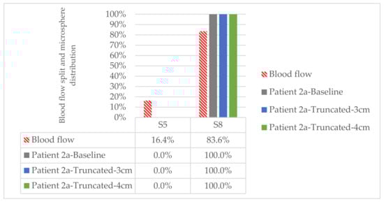 Figure 6 shows differences between Patient 2a-Baseline and Patient 2a-Truncated-3cm velocity magnitude contours and vectors in the systolic peak (see the area of the high-velocity regions Figure 6a,b). This could potentially result in differences at the injection conditions and therefore in the microsphere distribution. As explained before, an extra case with an extra upstream centimeter was built to assess this difference. Indeed, Figure 6c shows that the results of Patient 2a-Truncated-4cm improve compared to Patient 2a-Truncated-3cm. Regarding the segment-to-segment microsphere distributions, all the cases show a S8-directed treatment (i.e., 100% microspheres targeting S8). Thus, even though some minor qualitative differences can be seen between Patient 2a-Baseline and Patient 2a-Truncated-3cm, the latter can be taken as valid because no differences in microsphere distribution are observed.